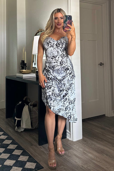 Wild Side Bustier Satin Python Midi Dress: Gray
